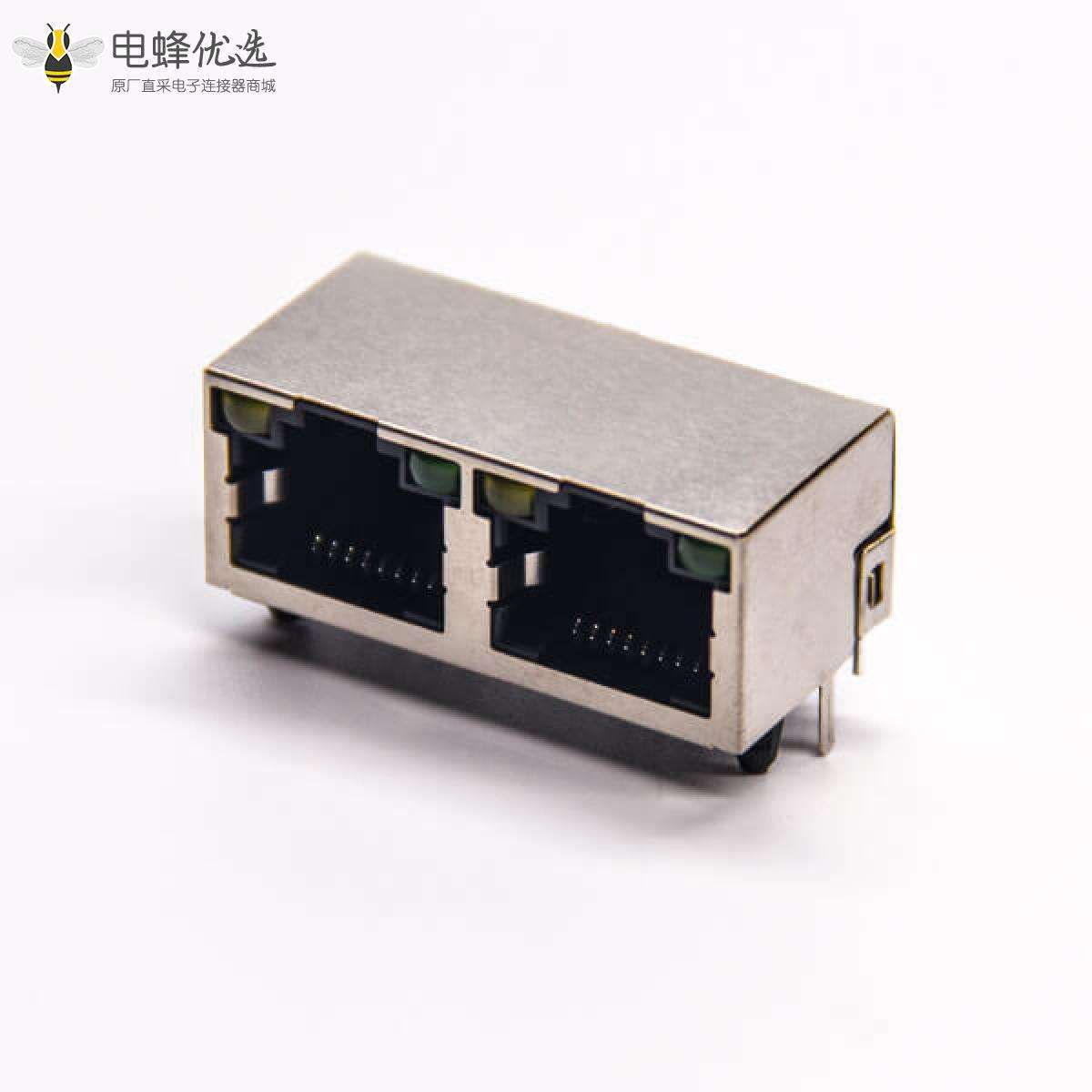 RJ45插座,8P8C,双端口,1*2,弯式90°,触头镀金,插孔,PCB板安装,带屏蔽,带灯,不带滤波;