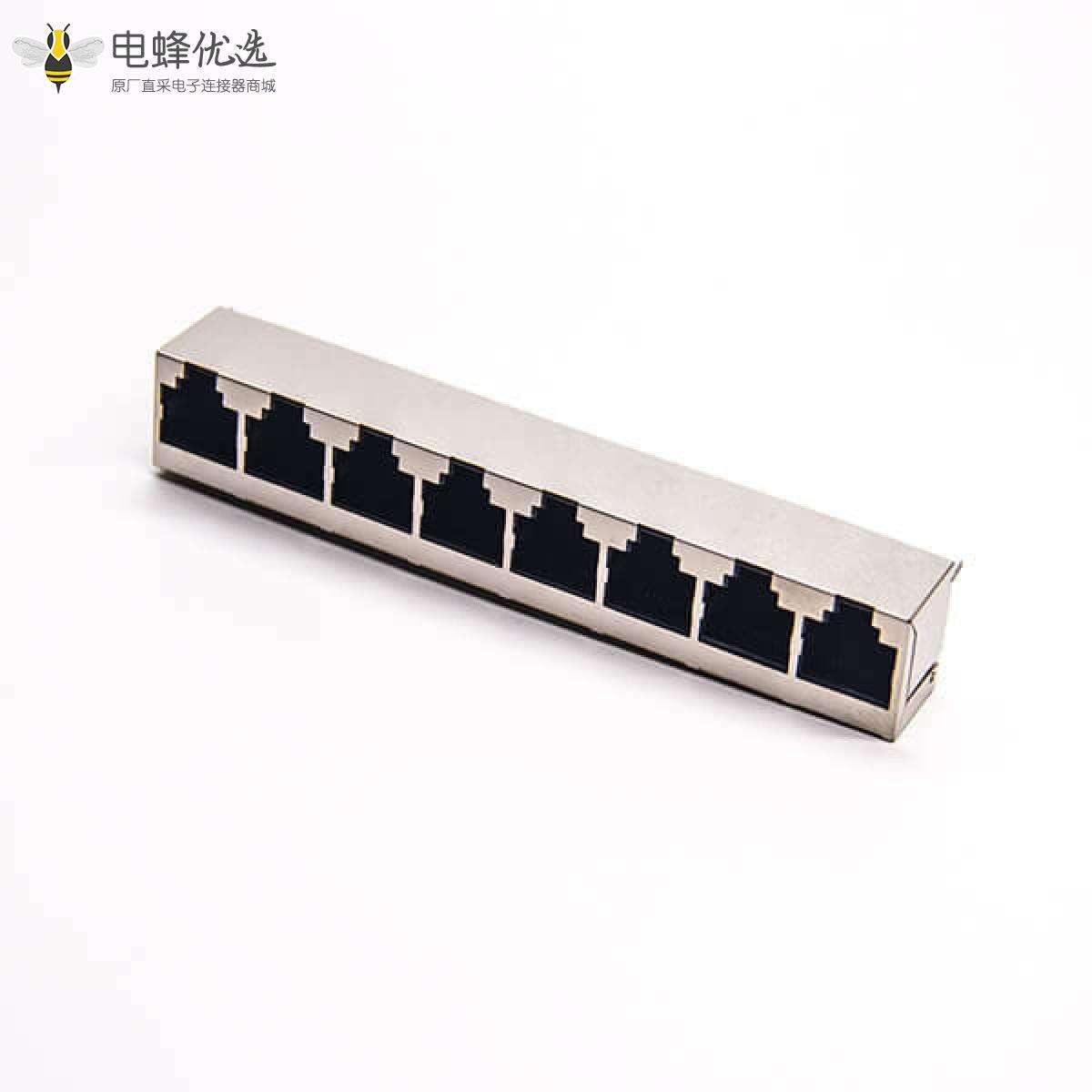RJ45插座,8P8C,8端口,1*8,直式180°,触头镀金,插孔,PCB板安装,带屏蔽,不带灯,不带滤波;