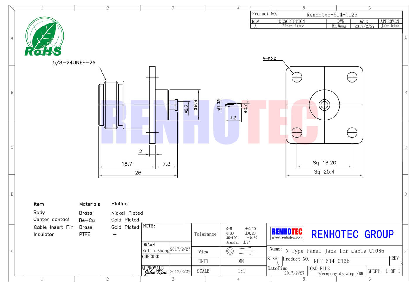 - n连接器,同轴线缆,母头,50欧,直式,4孔法兰,UT085 ,面板安装;