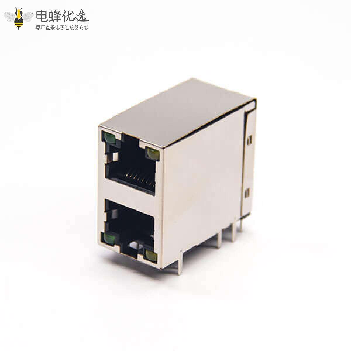 RJ45插座,8P8C,单端口,2*1,弯式90°,触头镀金,插孔,PCB板安装,带屏蔽,带灯,不带滤波;