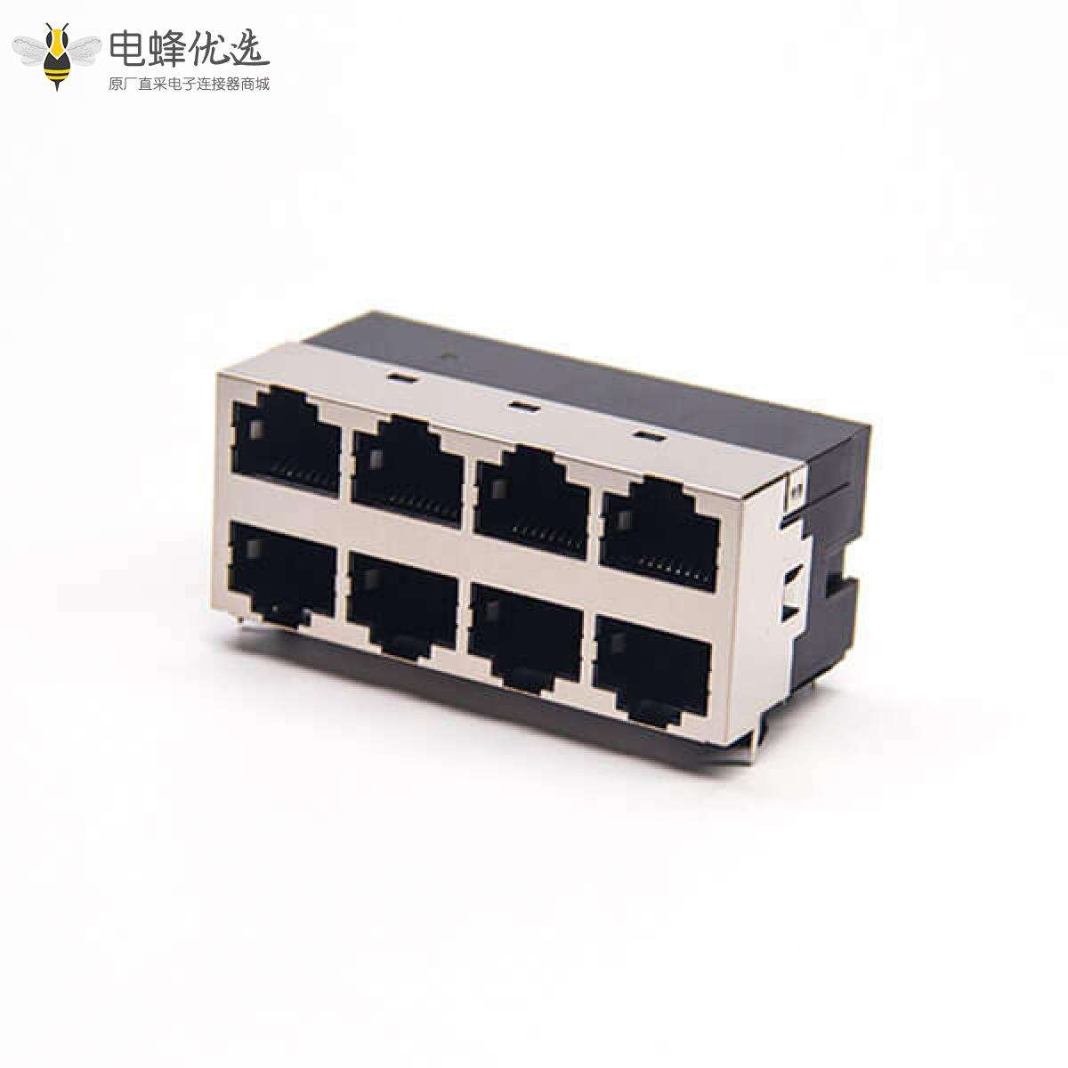 RJ45插座,8P8C,8端口,2*4,弯式90°,触头镀金,插孔,PCB板安装,带屏蔽,不带灯,不带滤波;