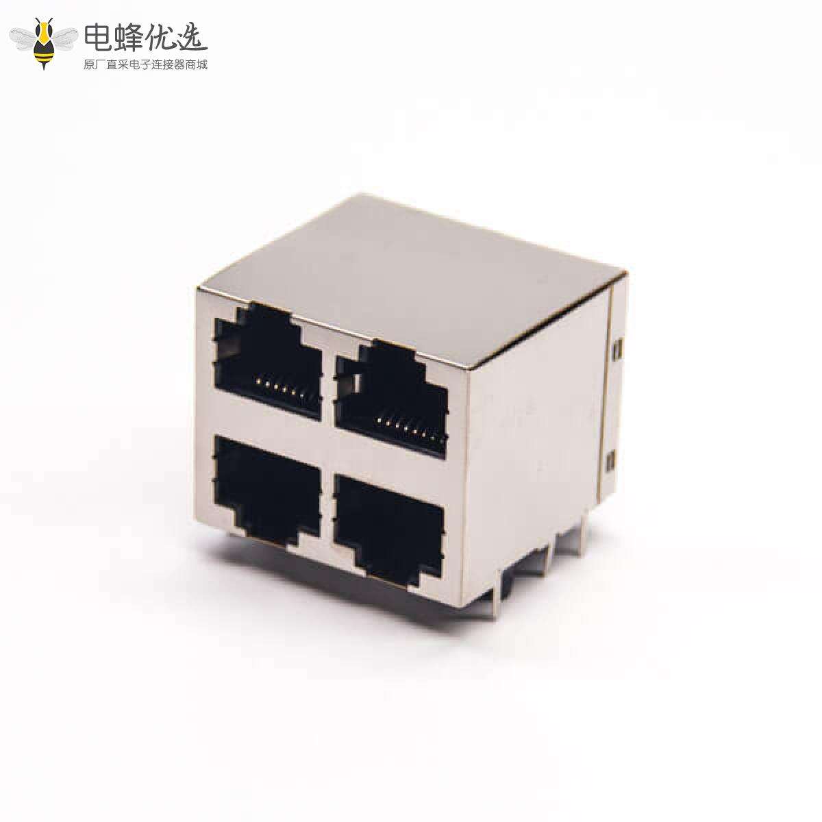 RJ45插座,8P8C,4端口,2*2,弯式90°,触头镀金,插孔,PCB板安装,带屏蔽,不带灯,不带滤波;