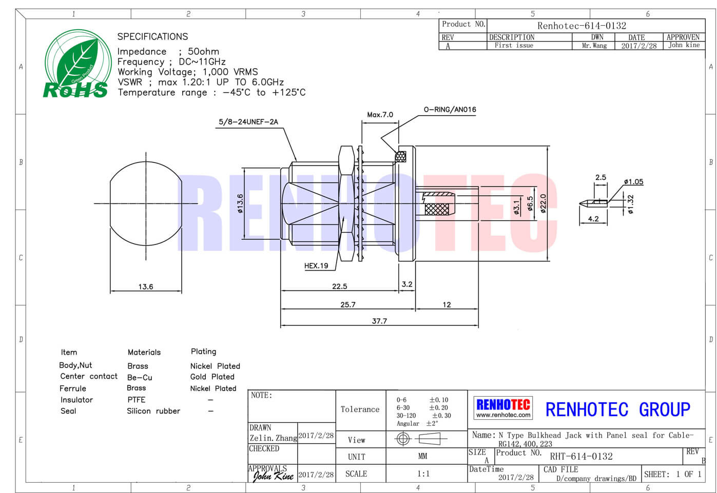 - n连接器,同轴线缆,母头,50欧,直式,RG142,400,223 ,面板安装,直式,防水,穿墙;
