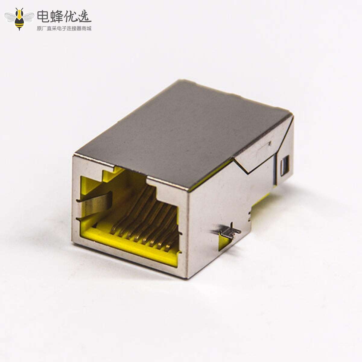 RJ45插座,8P8C,单端口,1*1,弯式90°,触头镀金,沉板,贴板,PCB板安装,带屏蔽,不带灯,不带滤波;