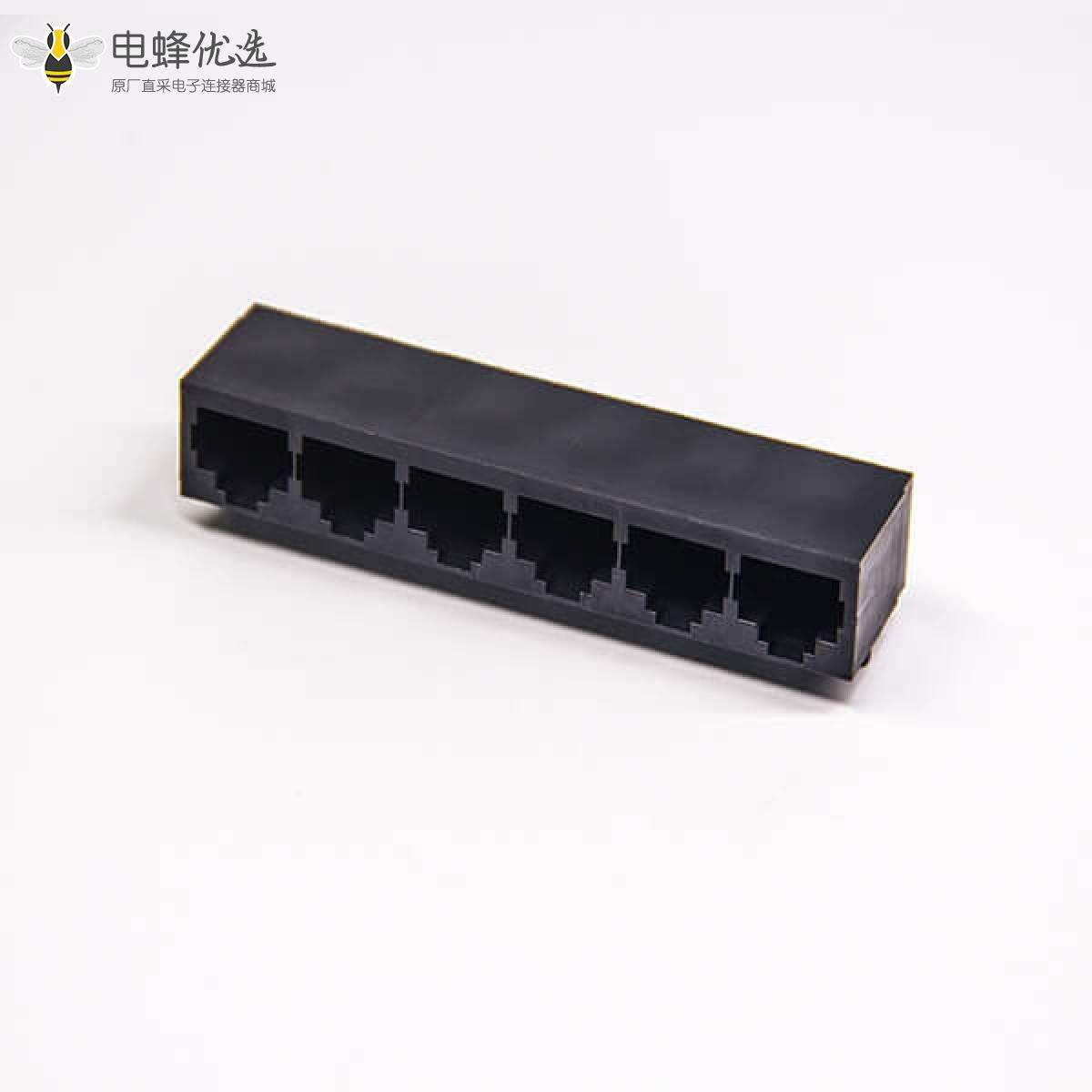 RJ45插座,10P8C,6端口,1*6,弯式90°,触头镀金,插板,PCB板安装,不带屏蔽,不带灯,不带滤波;