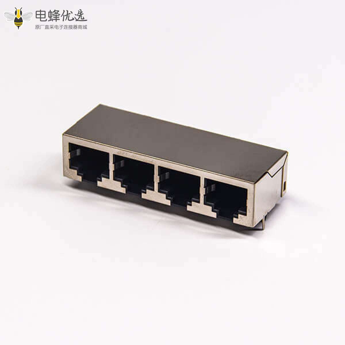 RJ45插座,8P8C,4端口,1*4,弯式90°,触头镀金,插板,PCB板安装,带屏蔽,不带灯,不带滤波;