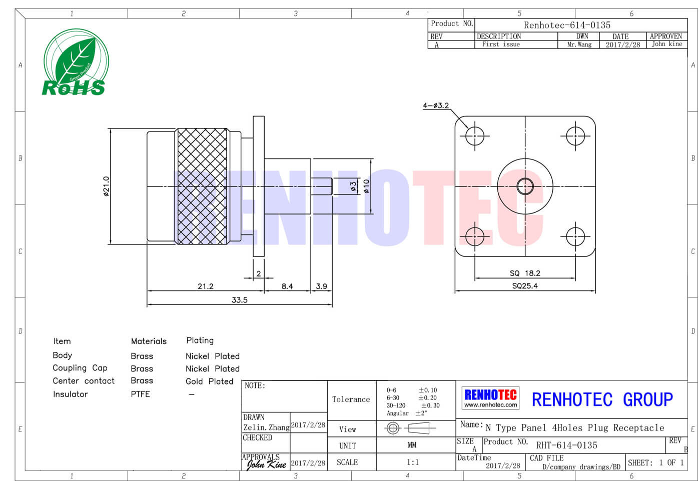 - n连接器,公头,50欧,直式,4孔法兰,面板安装;