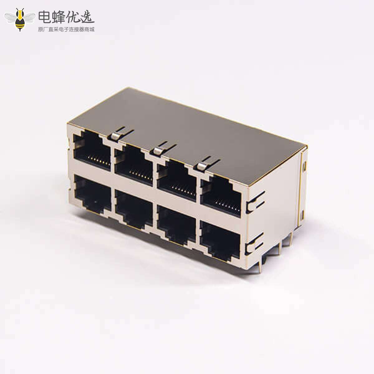 RJ45插座,8P8C,8端口,2*4,弯式91°,触头镀金,插孔,PCB板安装,带屏蔽,不带灯,不带滤波,带弹片;