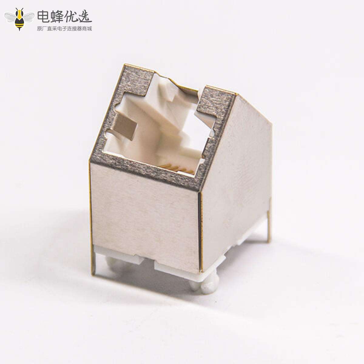 RJ45插座,8P8C,单端口,1*1,弯式45°,触头镀金,插孔,PCB板安装,带屏蔽,不带灯,不带滤波;