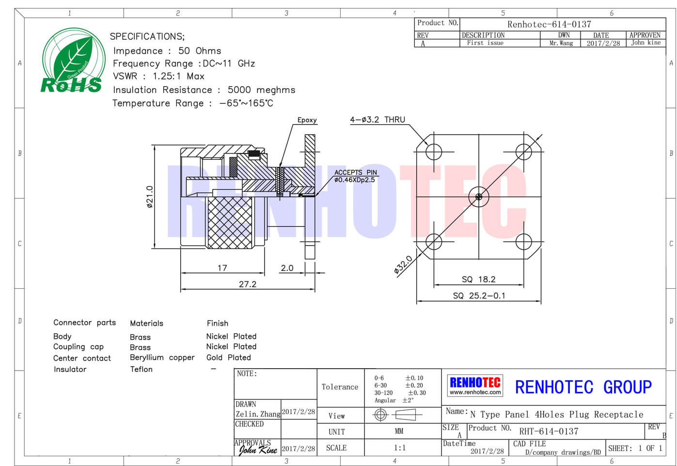 - 高性能连接器,频率范围达0到11GHz,阻抗50欧姆;