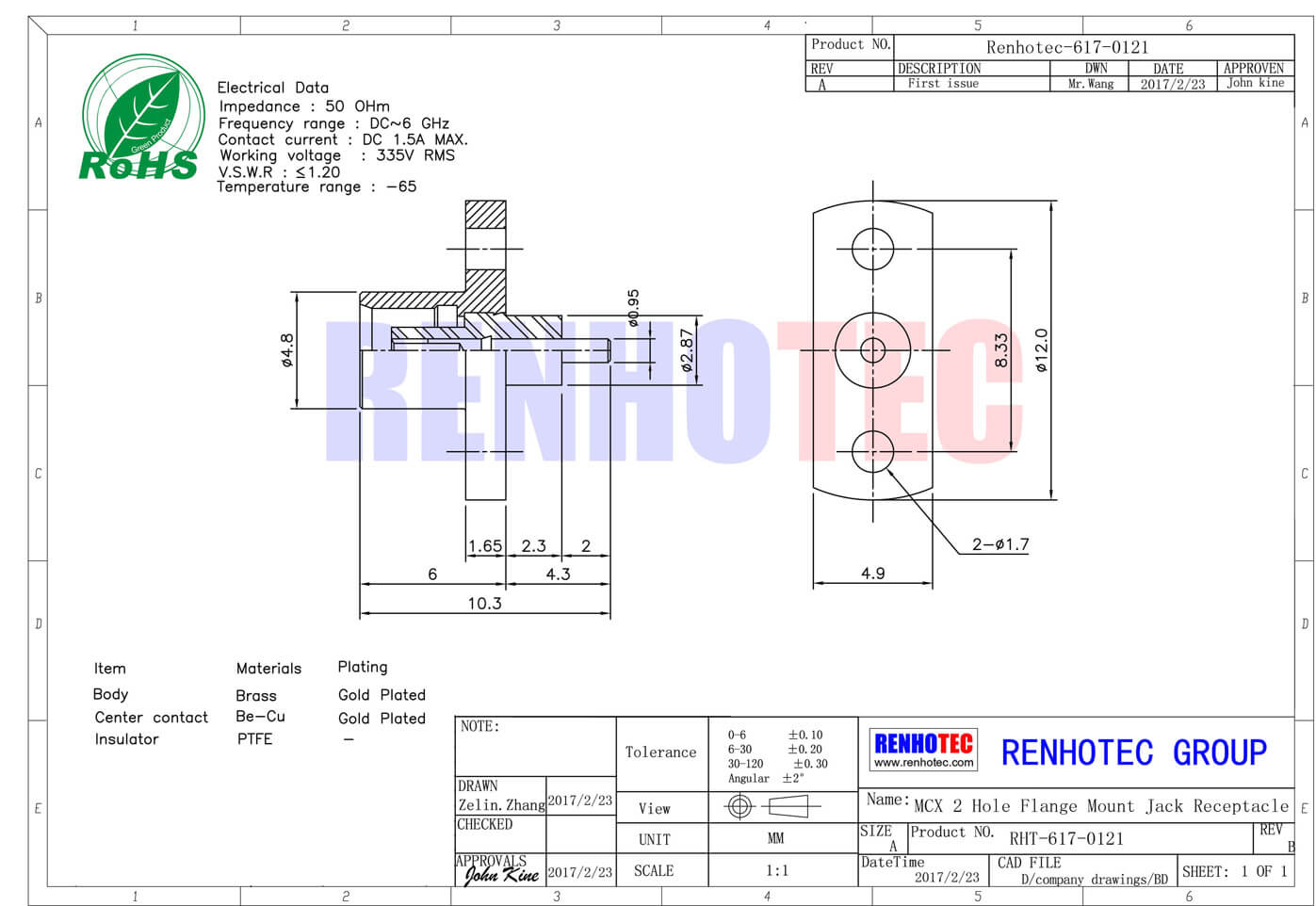 - mcx连接器,2孔法兰,母头,50欧,直式,面板安装;