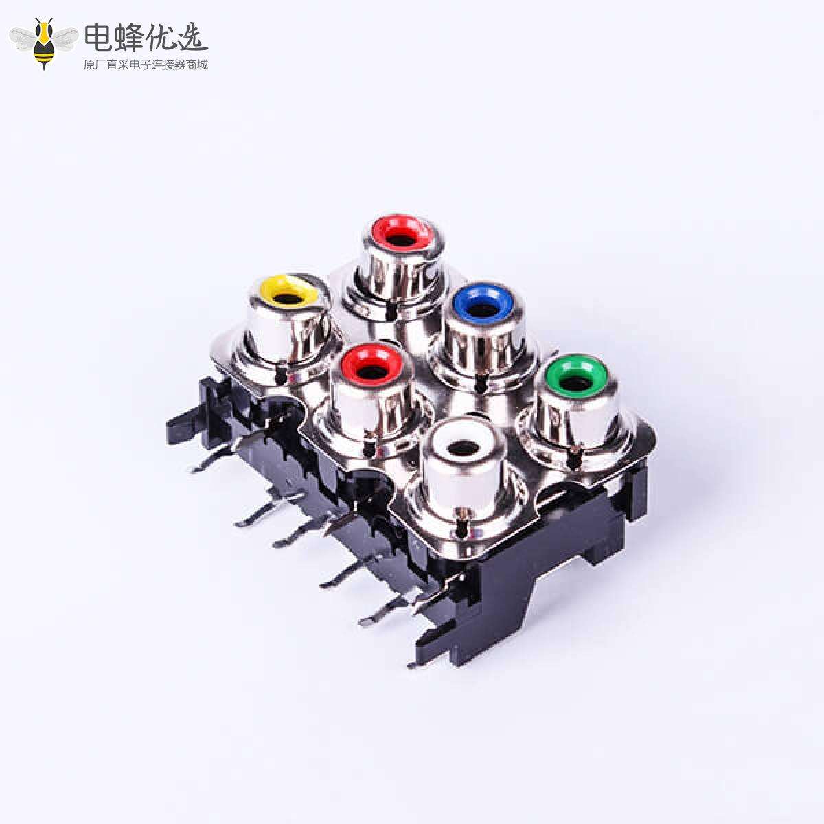 RCA连接器,母,插座,90°弯式,6孔,2*3,接板,插板,黑色塑胶,ABS.PBT,镀镍;