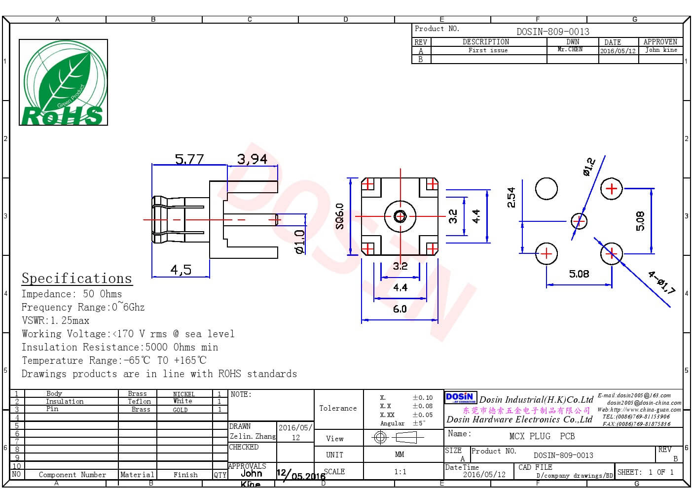 - mcx连接器,pcb板,公头,50欧,直插;