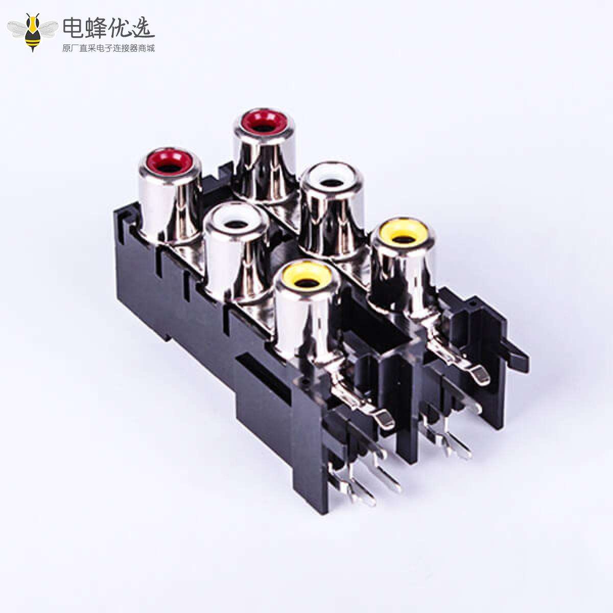 RCA连接器,母,插座,90°弯式,6孔,2*3,接板,焊板,黑色塑胶,ABS.PBT,镀镍;