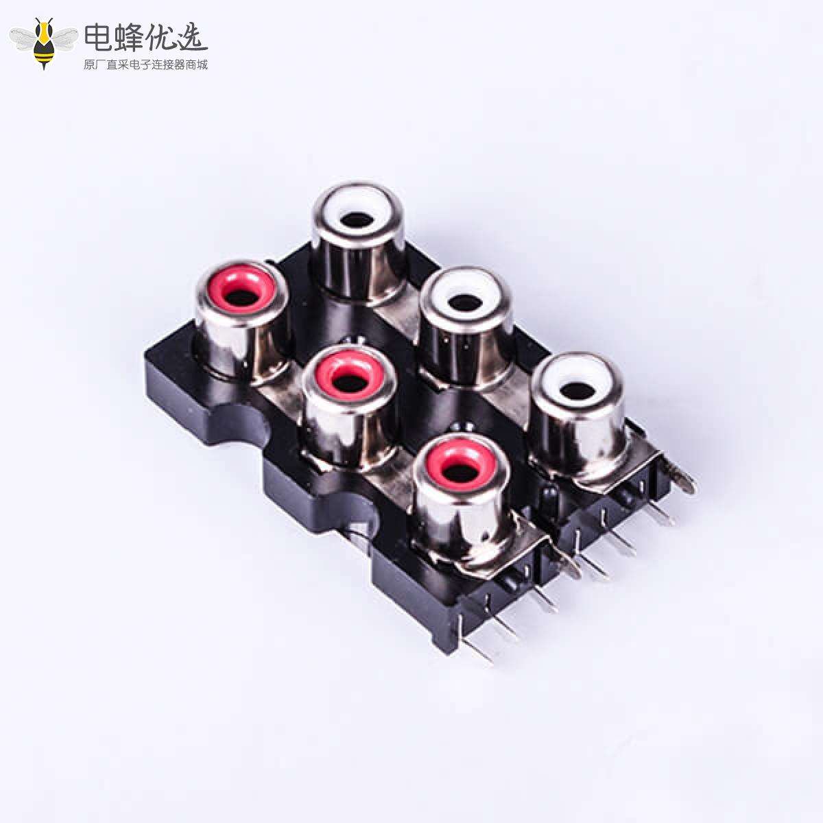 RCA连接器,母,插座,90°弯式,6孔,2*3,接板,焊板,黑色塑胶,ABS.PBT,镀镍;