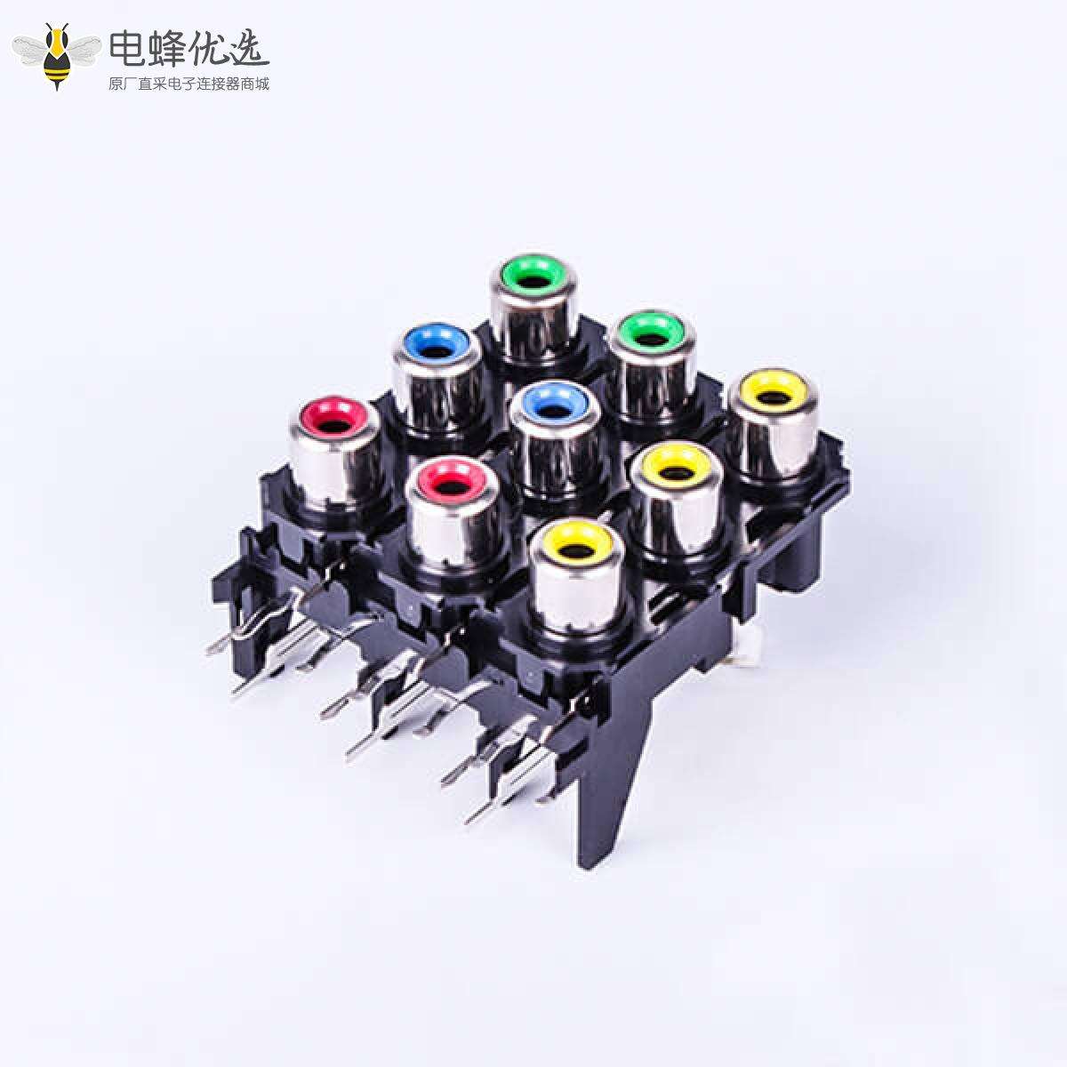 RCA连接器,母,插座,90°弯式,9孔,3*3,接板,焊板,黑色塑胶,ABS.PBT,镀镍;