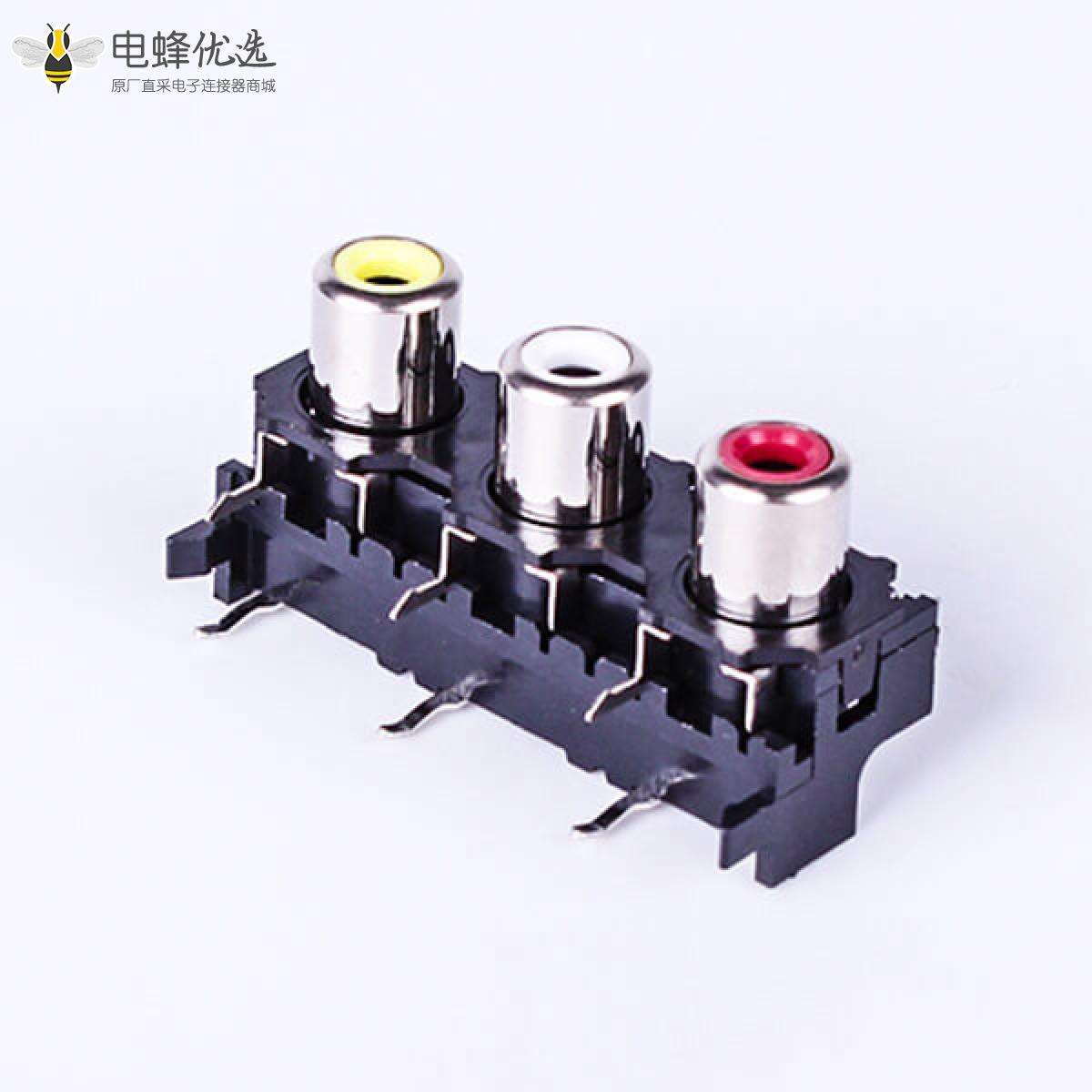 RCA连接器,母,插座,90°弯式,3孔,1*3,带螺丝孔,接板,焊板,黑色塑胶,ABS.PBT,镀镍;