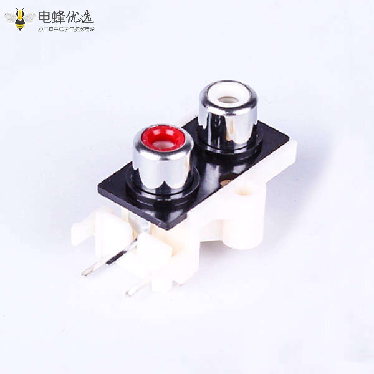 RCA连接器,母,插座,90°弯式,2孔,2*1,接板,焊板,白色塑胶,ABS.PBT,镀镍;