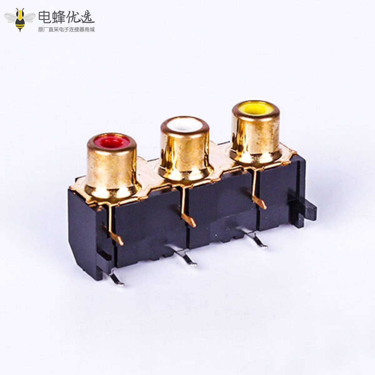 RCA连接器,母,插座,90°弯式,3孔,1*3,接板,插板,黑色塑胶,ABS.PBT,镀金;