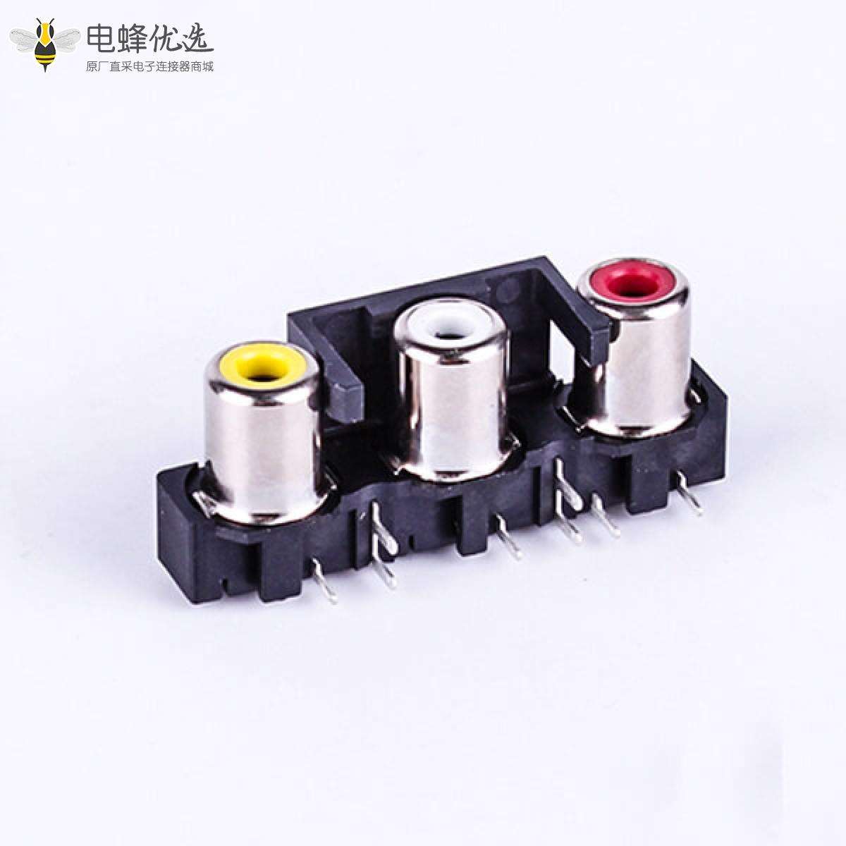 RCA连接器,母,插座,90°弯式,3孔,3连体,接板,插板,黑色塑胶,ABS.PBT,镀镍;