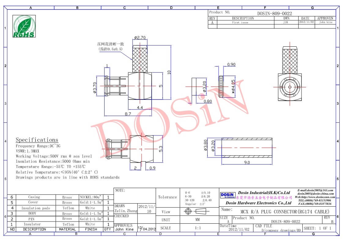 - mcx连接器,同轴线缆,公头,50欧,弯式,RG316,压接;