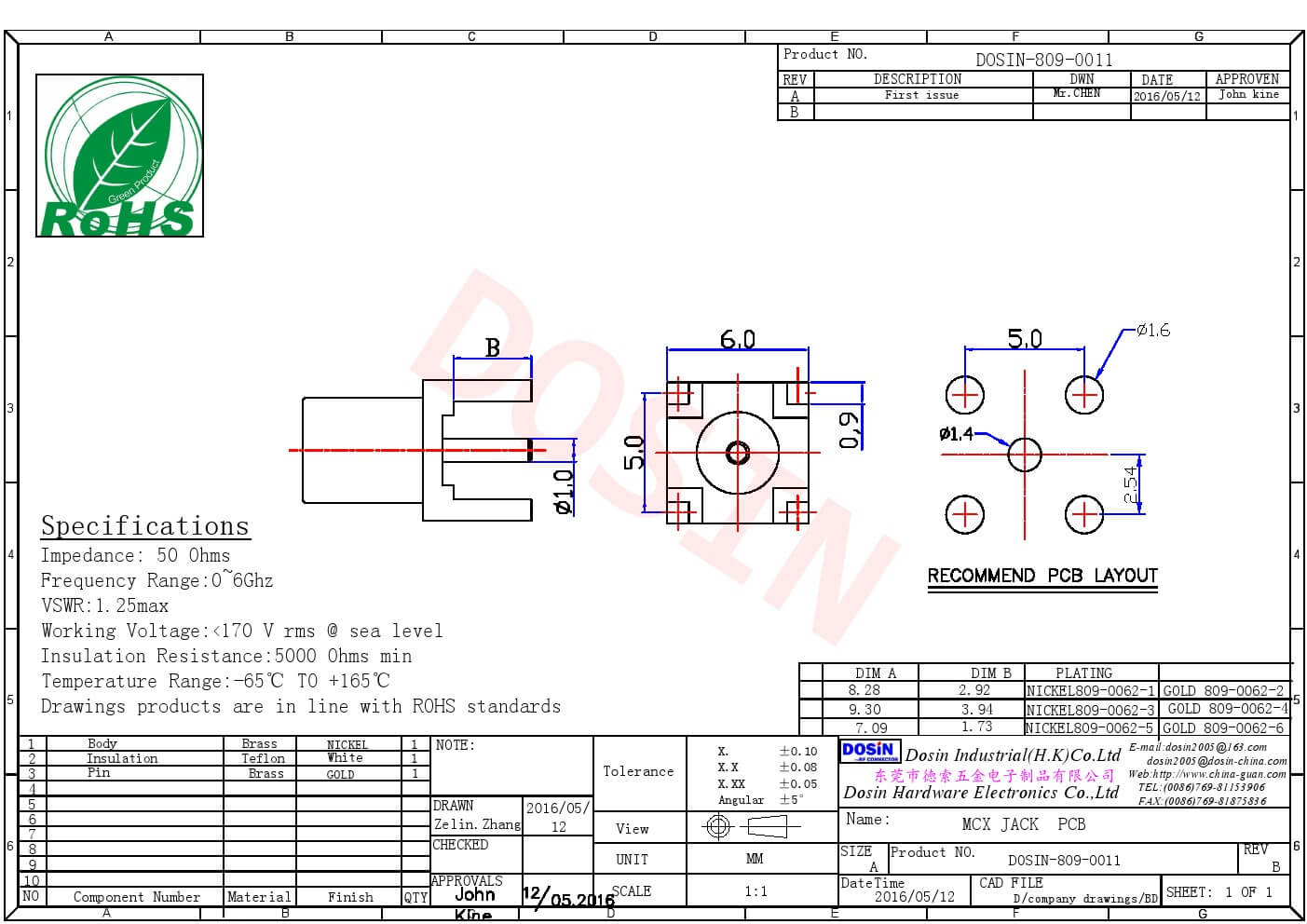 - 中心接触电阻: ≦ 5.0 mΩ (Milliohms max.)