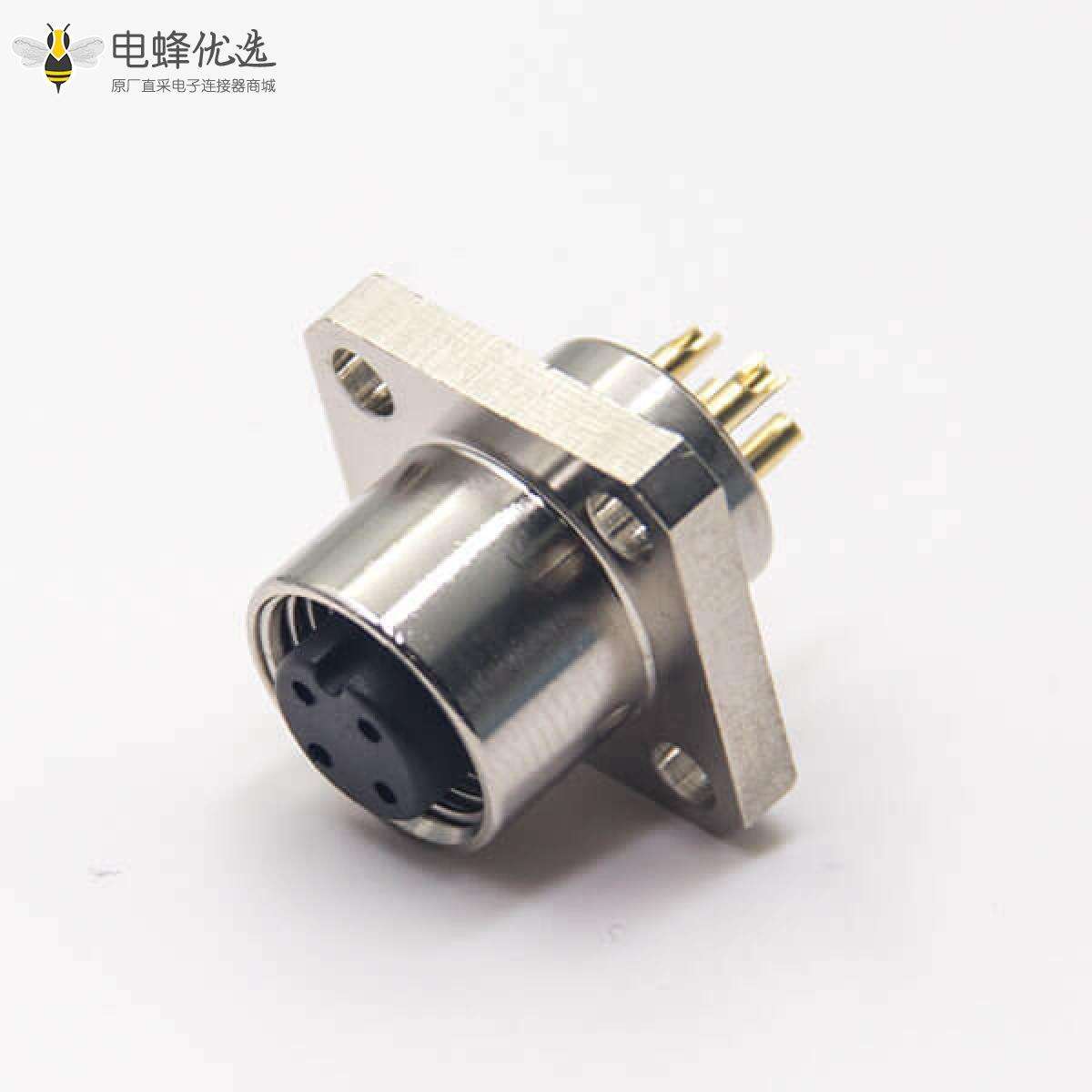 - M12板端插座,A编码,4芯,直式,母头,焊线,4孔法兰,面板安装;