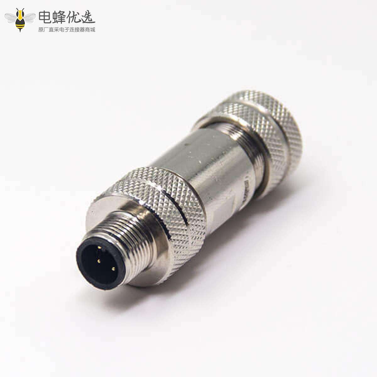 - M12,组装接头,A编码,4芯,直式,公头,接线,螺丝锁线,带屏蔽;