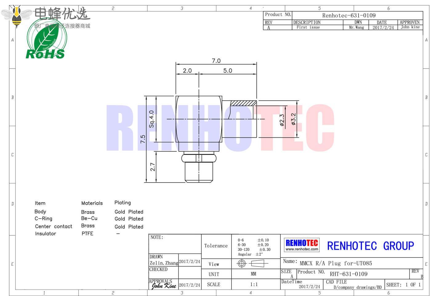 - mmcx连接器,同轴线缆,公头,50欧,弯式,焊接,UT085;