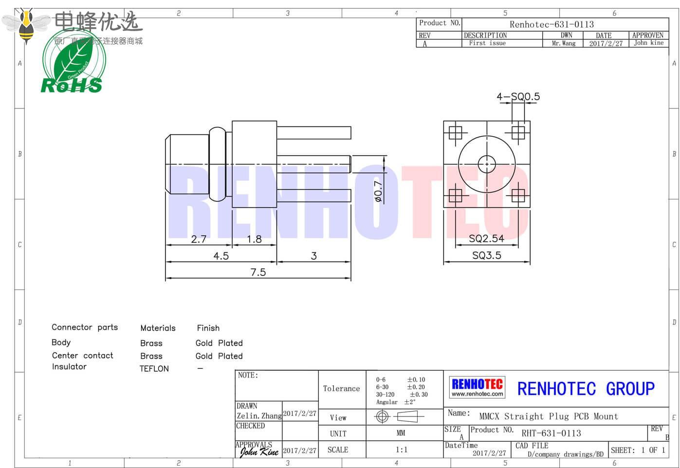- mmcx连接器,pcb板,公头,50欧,直插;