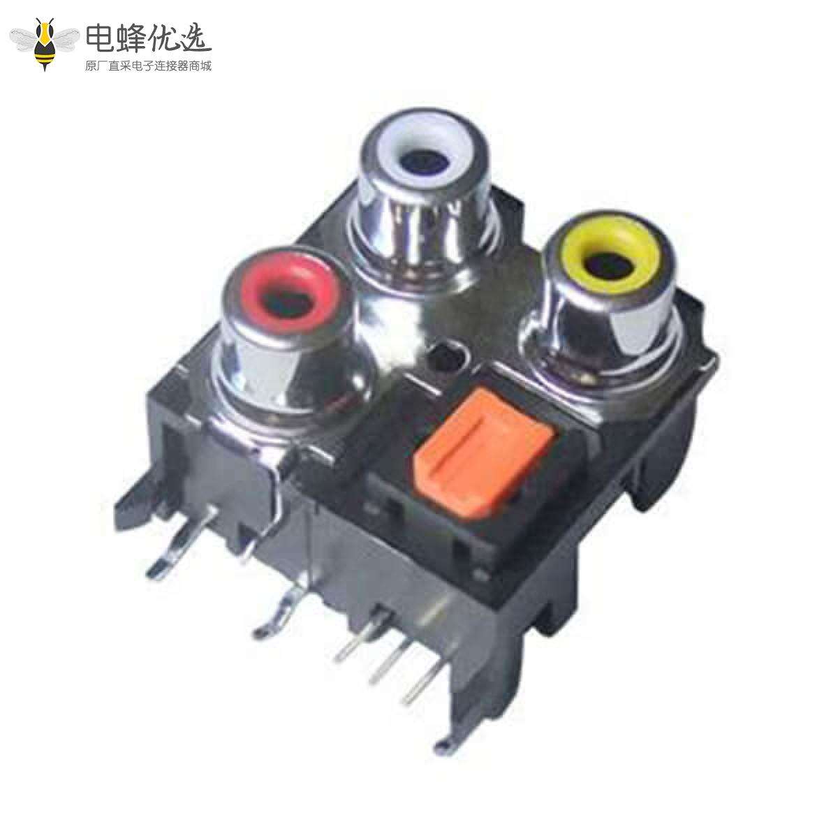 RCA连接器,母,插座,90°弯式,3孔,接板,插板,带光纤端子,黑色塑胶,ABS.PBT,镀镍;