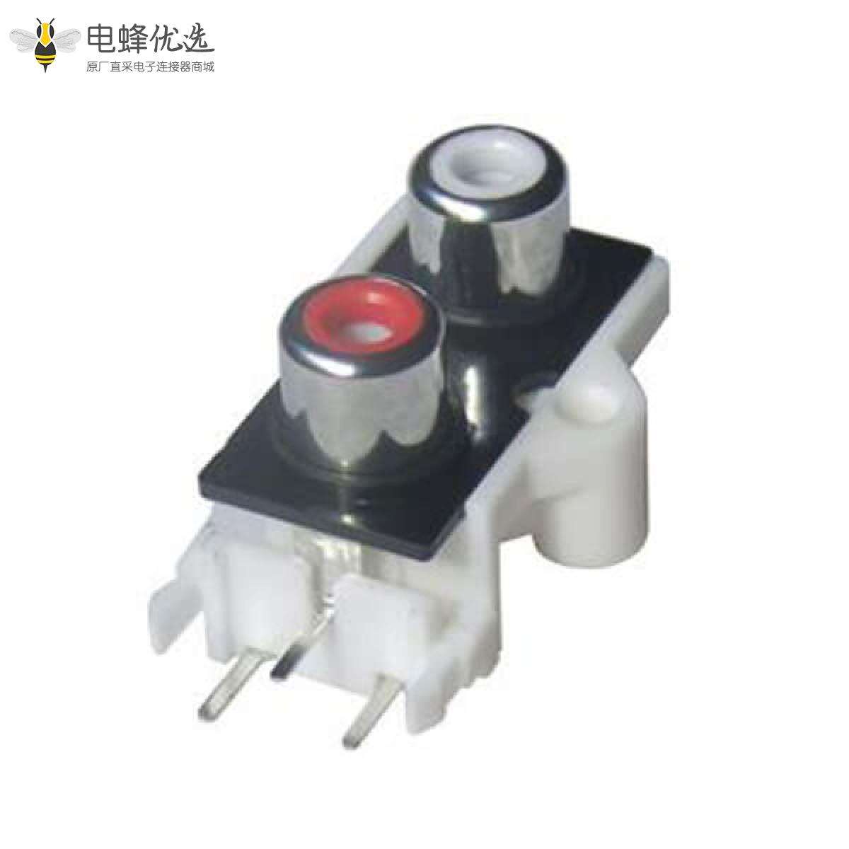 RCA连接器,母,插座,90°弯式,2孔,2*1,接板,插板,带金属屏蔽,白色塑胶,ABS.PBT,镀镍;