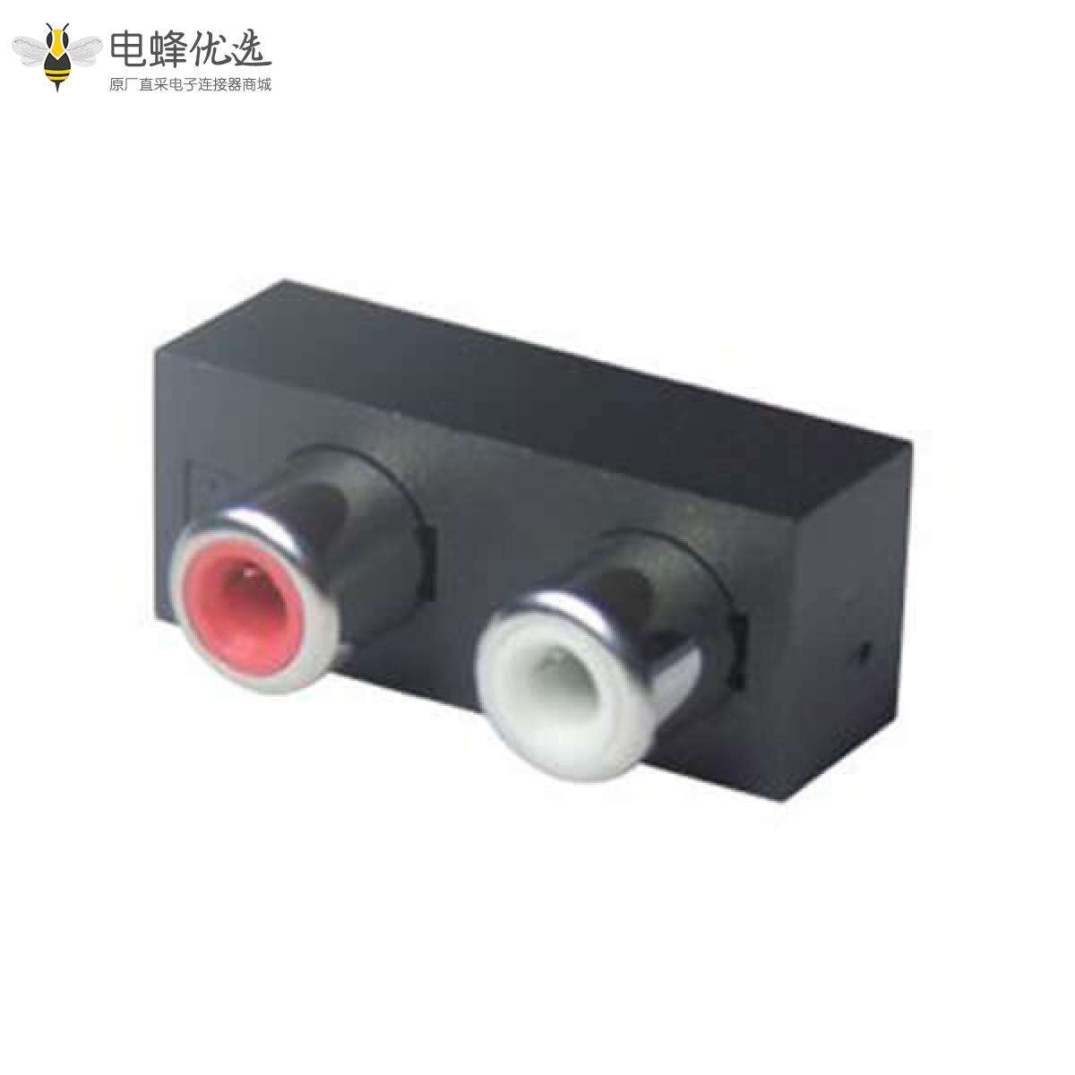 RCA连接器,母,插座,90°弯式,单排,2孔,1*2,接板,插板,黑色塑胶,ABS.PBT,镀镍;