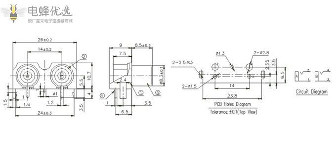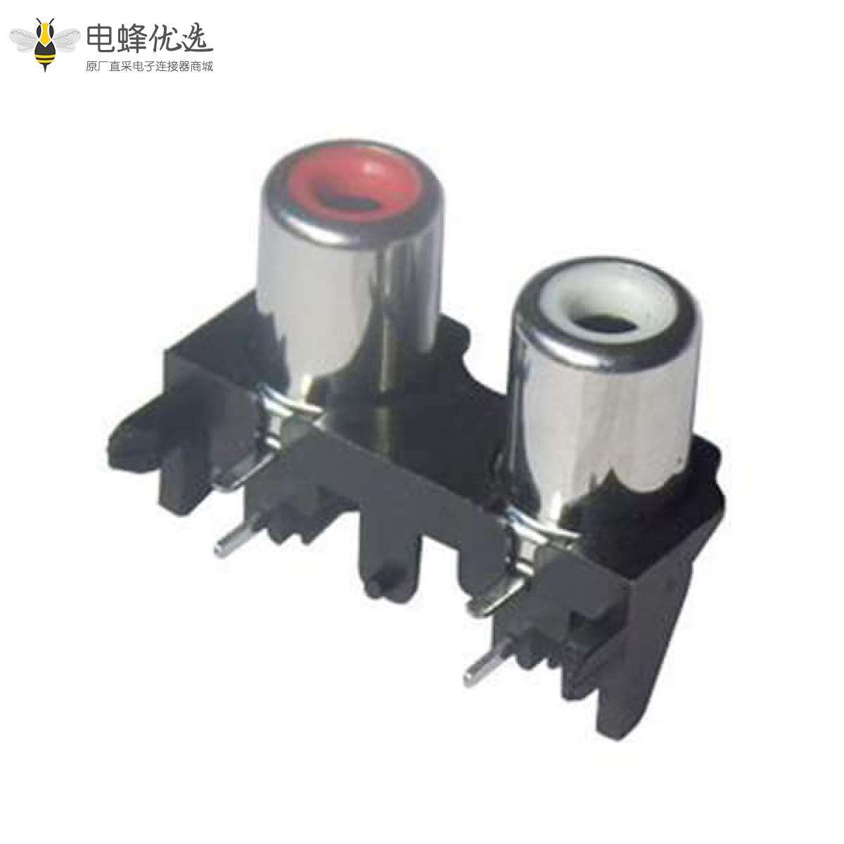 RCA连接器,母,插座,90°弯式,2孔,1*2,接板,插板,带金属屏蔽,黑色塑胶,ABS.PBT,镀镍;