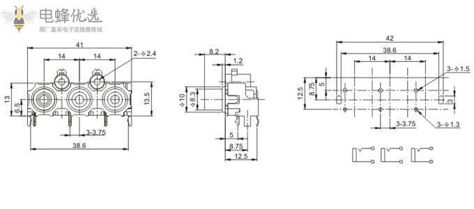 1×3RCA同轴连接器90度弯式焊板接口
