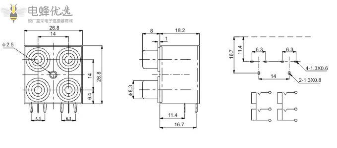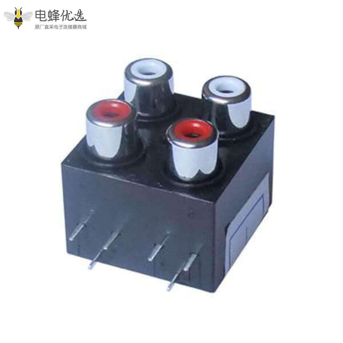 RCA连接器,母,插座,90°弯式,4孔,2*2,接板,插板,黑色塑胶,ABS.PBT,镀镍;