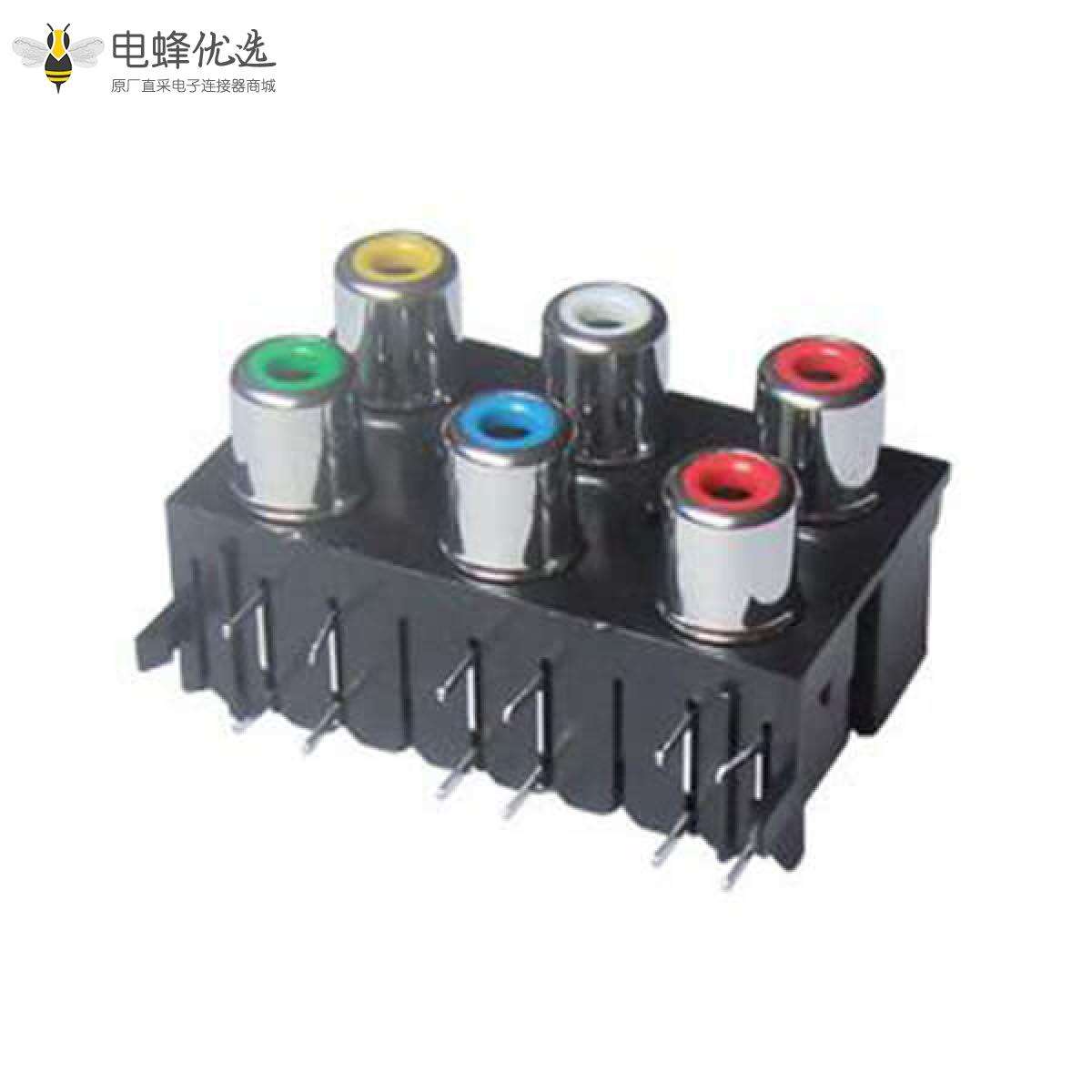 RCA连接器,母,插座,90°弯式,6孔,2*3,接板,插板,不带屏蔽,黑色塑胶,ABS.PBT,镀镍;
