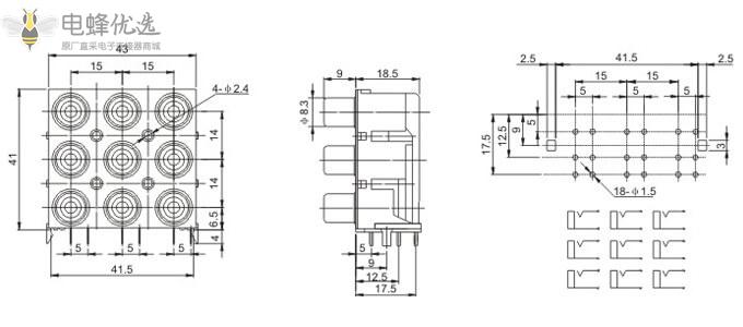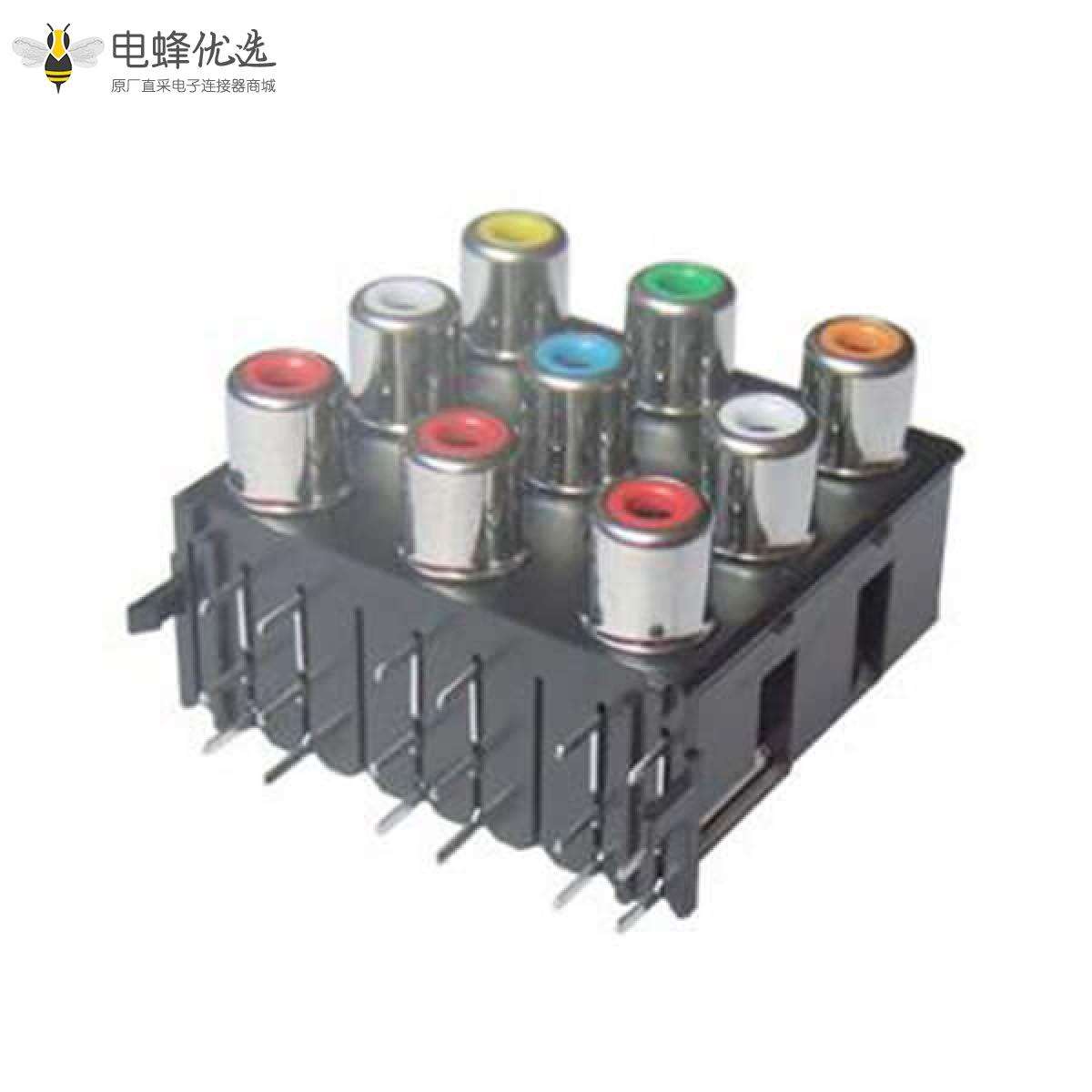 RCA连接器,母,插座,90°弯式,9孔,3*3,接板,插板,不带屏蔽,黑色塑胶,ABS.PBT,镀镍;