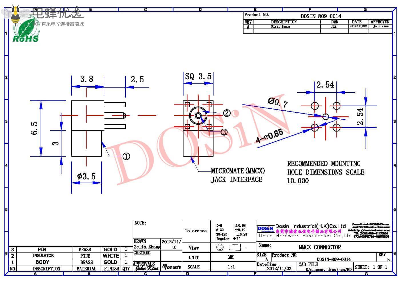 - mmcx连接器,pcb板,母头,50欧,弯插;