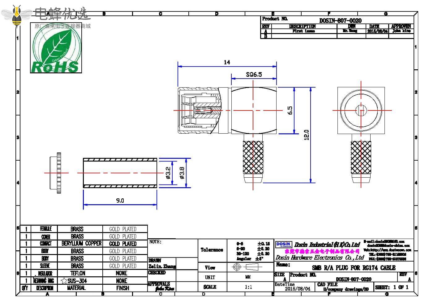- 压接,公头,弯式,RF射频同轴,SMB连接器,50欧姆,同轴线缆,RG174;