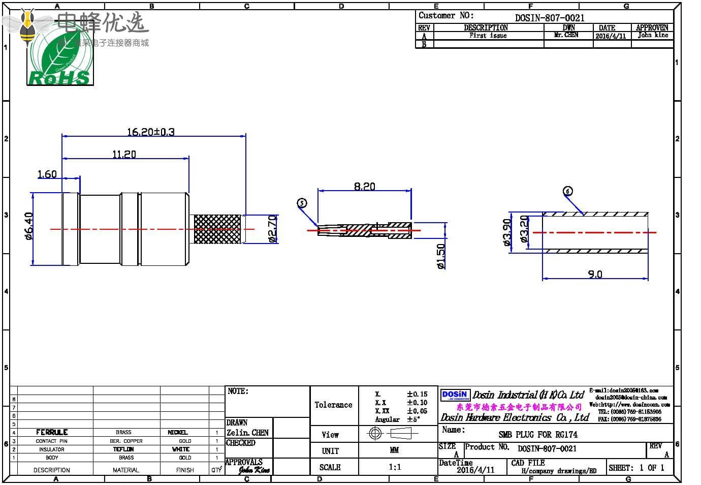 - 压接,公头,直式,RF射频同轴,SMB连接器,50欧姆,同轴线缆;