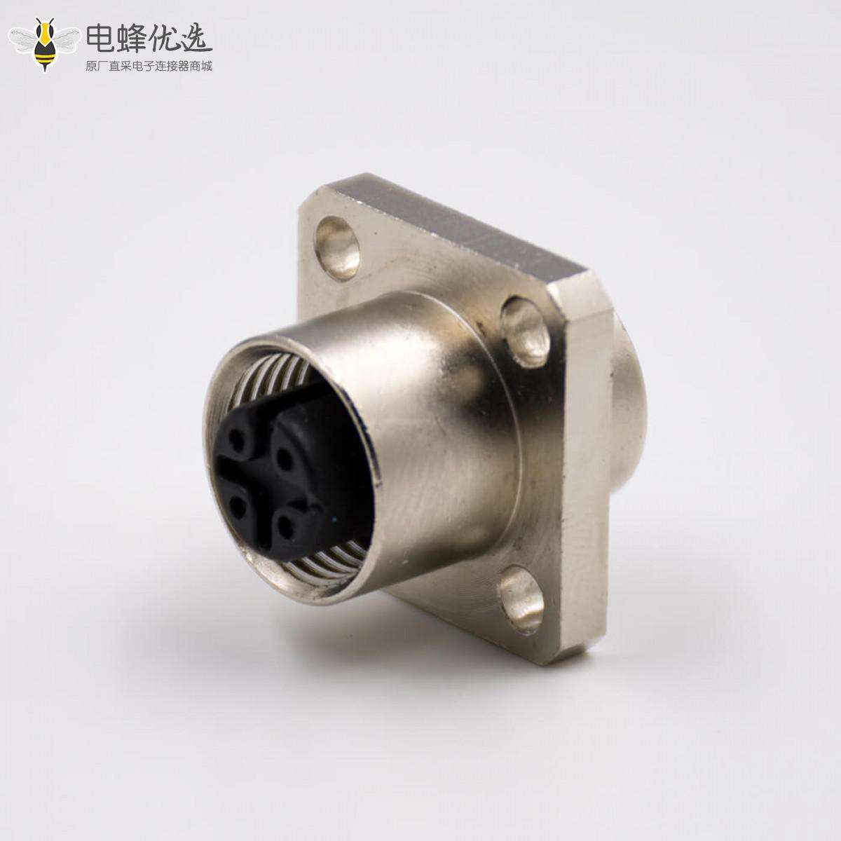 - M12板端插座,A扣,4芯,直式,母头,面板安装,4孔法兰;