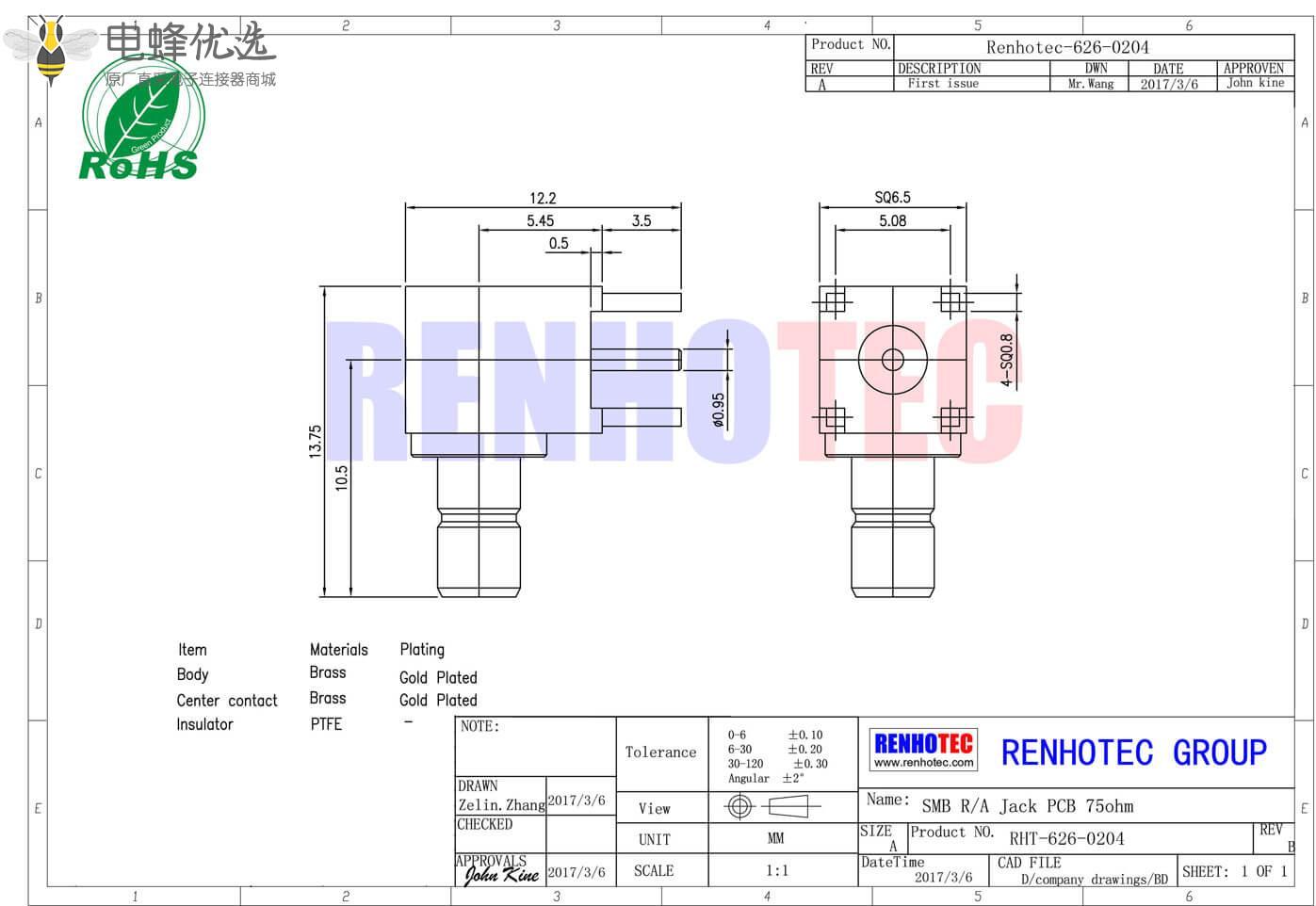 - PCB板端,母头,弯插,RF射频同轴,SMB连接器,75欧姆;