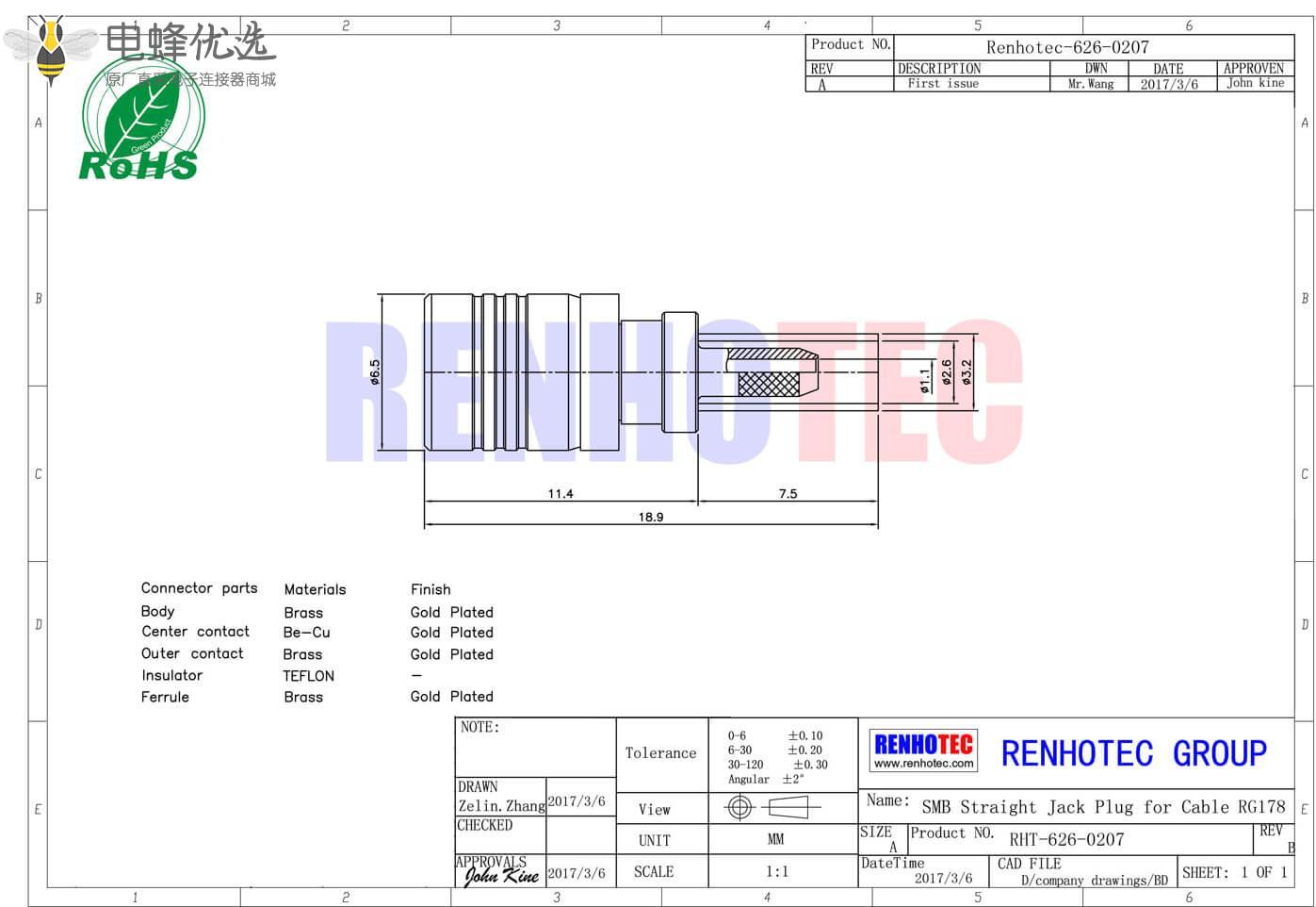 - 公头,直式,RF射频同轴,SMB连接器,50欧姆,同轴线缆,RG178,压接;