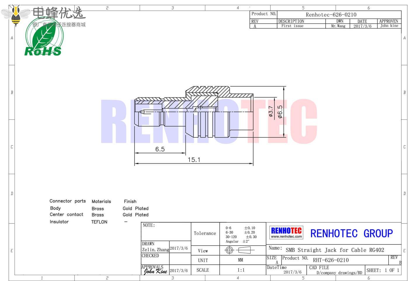 接RG142,RG405线缆时为250 V rms - 中心接触电阻: ≦ 6.0mΩ (Milliohms max.)