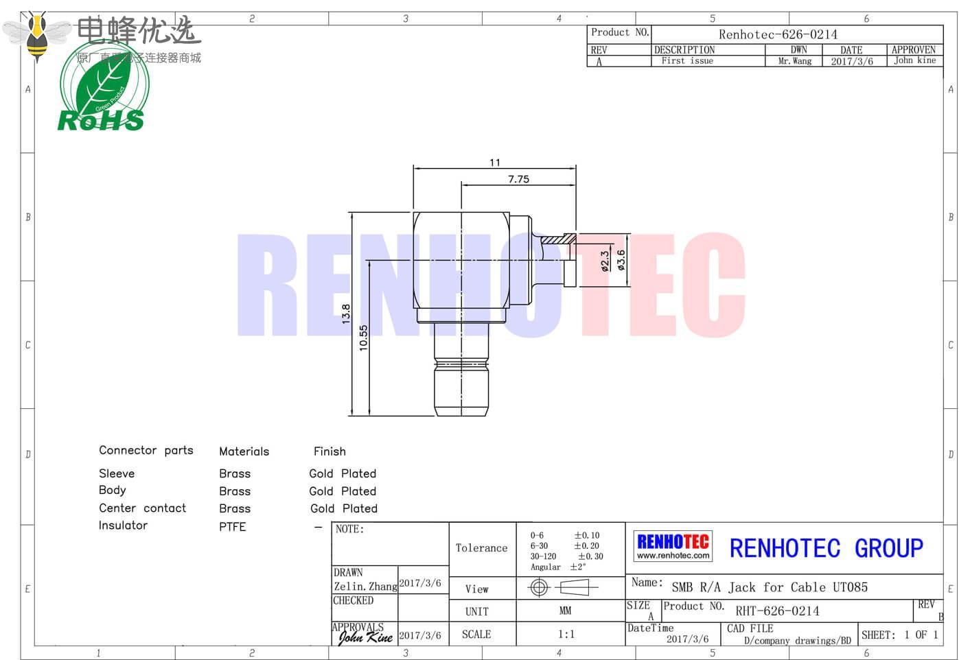 - 母头,弯式,RF射频同轴,SMB连接器,50欧姆,同轴线缆,焊接,UT085;