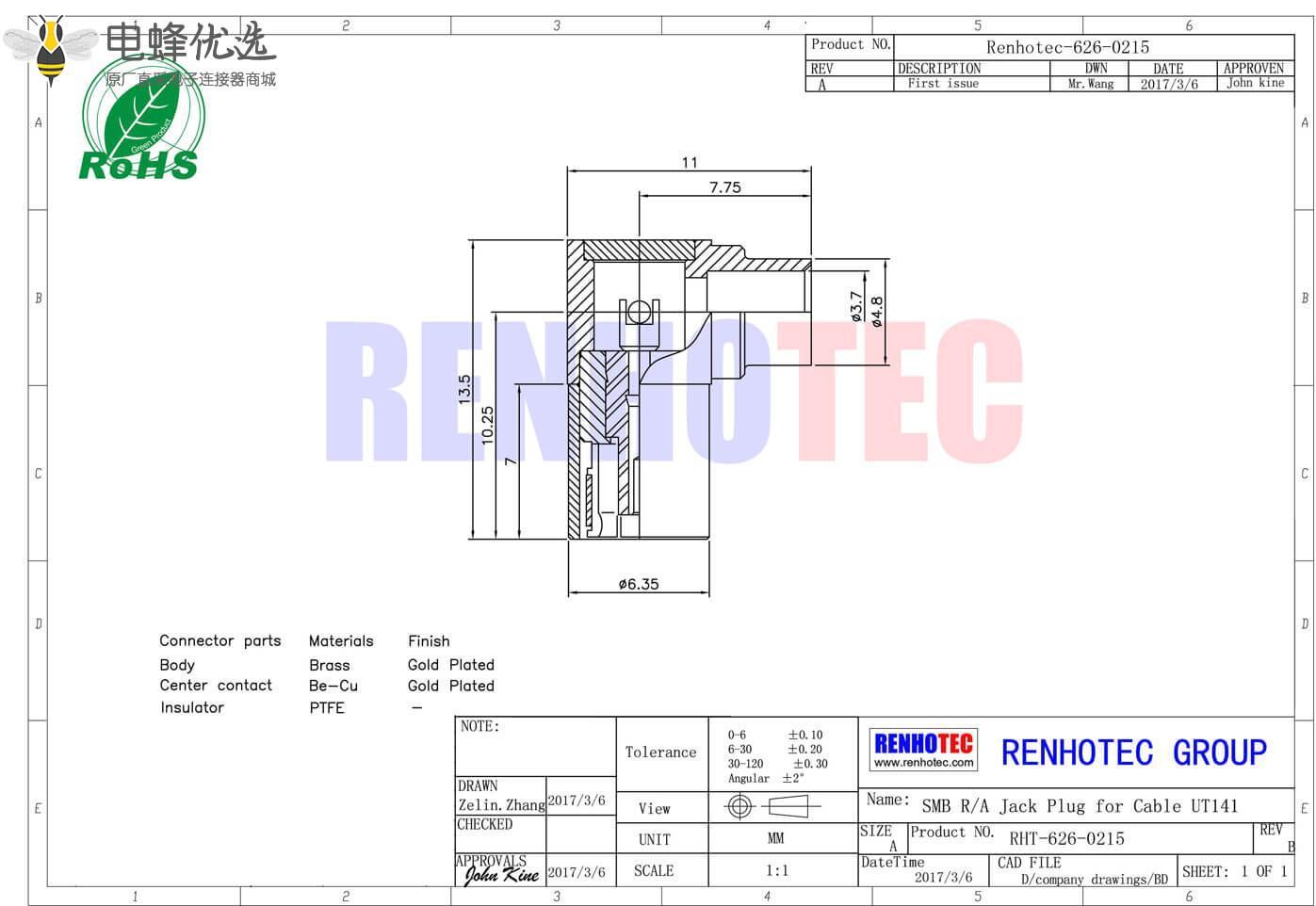 - 公头,弯式,RF射频同轴,SMB连接器,50欧姆,同轴线缆,焊接,UT141;