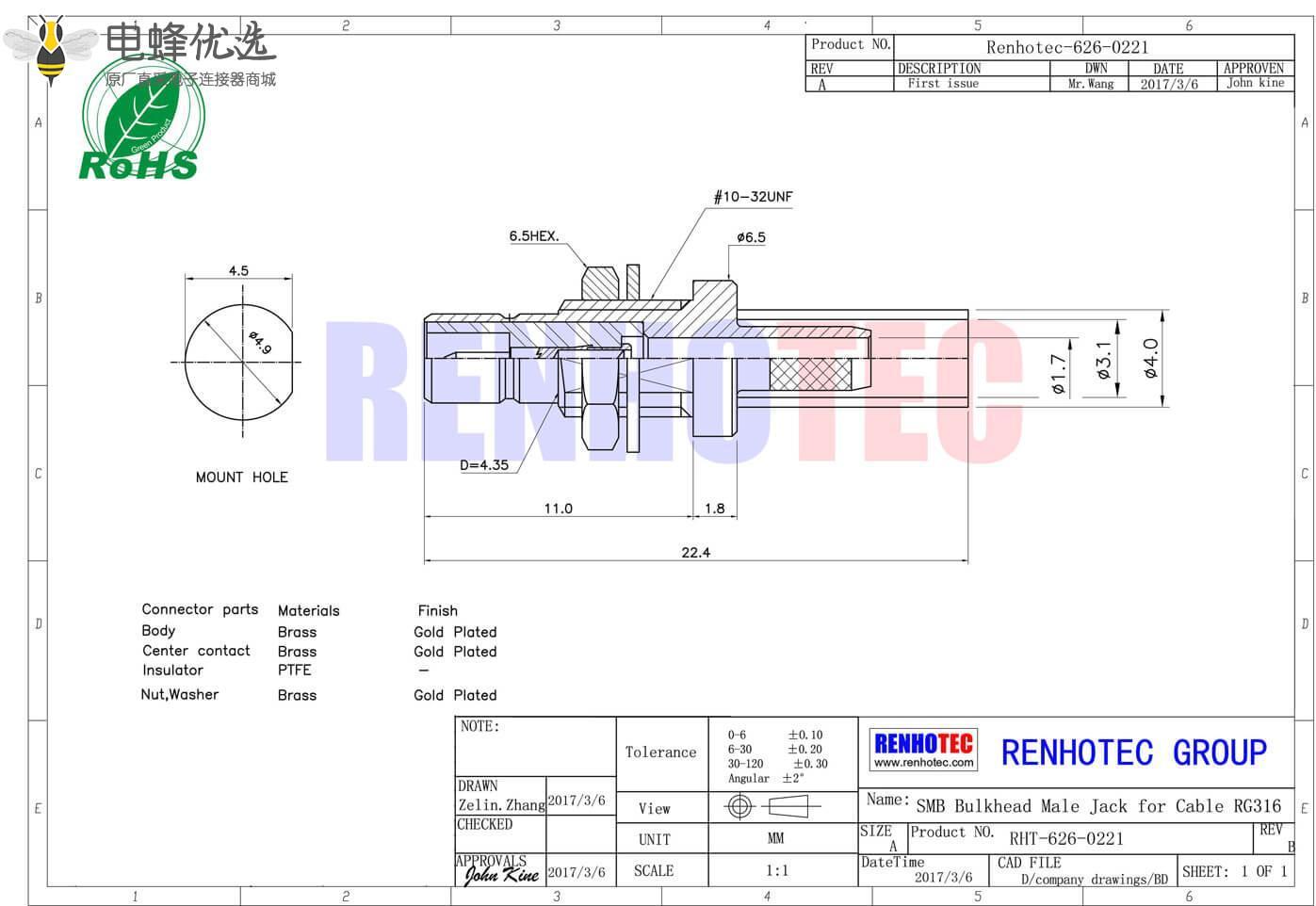 接RG142,RG405线缆时为250 V rms - 中心接触电阻: ≦ 6.0mΩ (Milliohms max.)