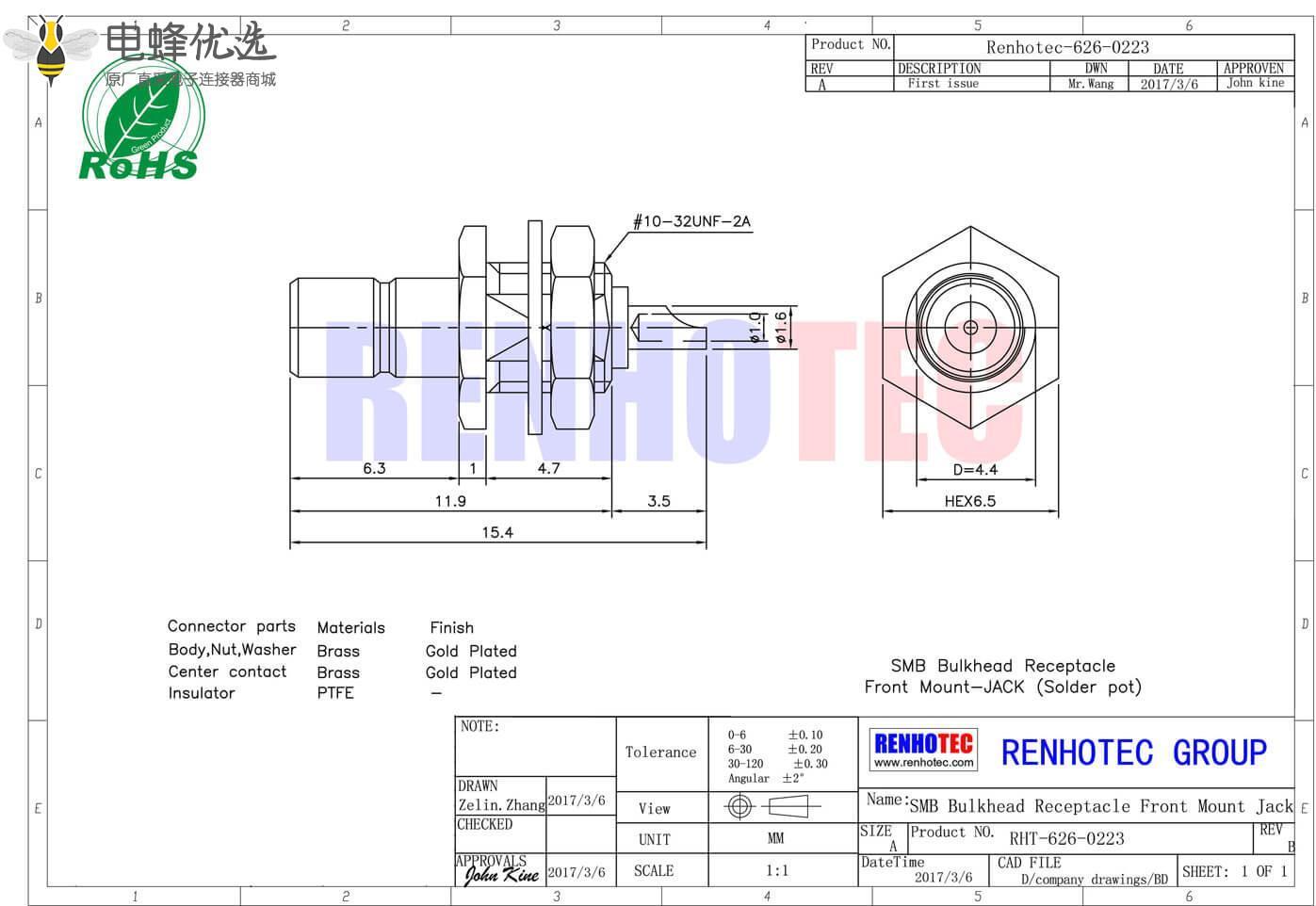 接RG142,RG405线缆时为250 V rms - 中心接触电阻: ≦ 6.0mΩ (Milliohms max.)
