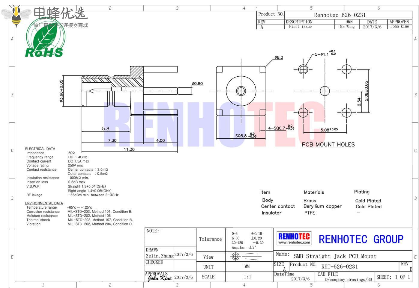 - PCB板端,母头,直插,RF射频同轴,SMB连接器,50欧姆;